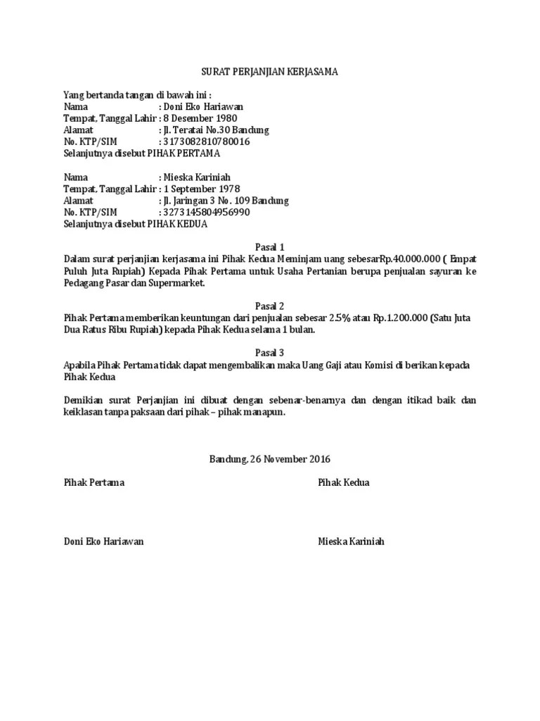 (1) kontrak ini adalah usaha/bisnis dengan sharing profit system (sistem bagi hasil), dimana pihak. Diatur sebagai berikut ini : Surat perjanjian kerjasama usaha pertanian komoditas cabai. Untuk membuat surat kerjasama usaha, kamu perlu mencantumkan judul surat, nomor surat, identitas diri pihak pertama dan pihak kedua, tujuan . Wajib menyerahkan keuntungan bagi hasil usaha kepada pewaris pihak.